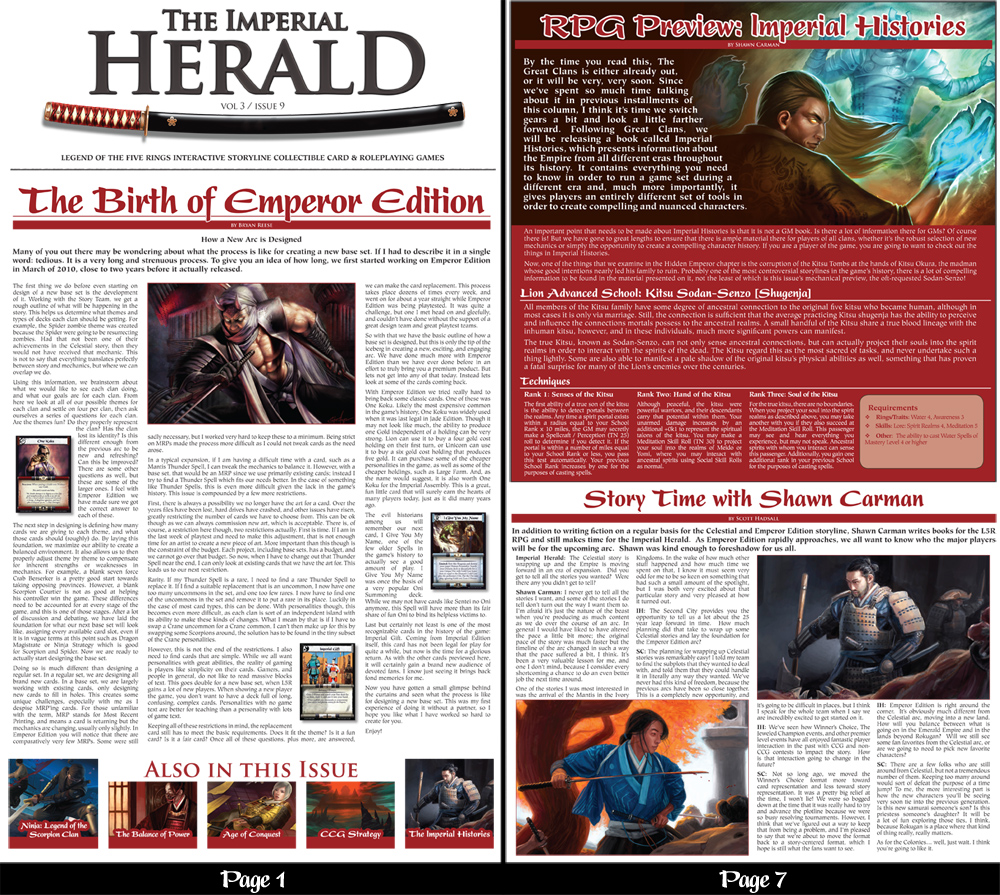 Commission; Layout and element fabrication for "The Imperial Herald" L5R Fanzine. 8 pages, newspaper format. Artwork and text copy provided by AEG. Required the fabrication of certain elements and ads. Made in Adobe InDesign with some element fabrication in Photoshop. rnLegend of the Five Rings is copyrighted by Alderac Entertainment Group and is not a property of SpookyElectricOnline.com. See www.l5r.com for more info about L5R. All artwork elements for the above work are property of AEG and may be copyrighted by the original artists. The above image is displayed and hosted on this website with AEG's permission.