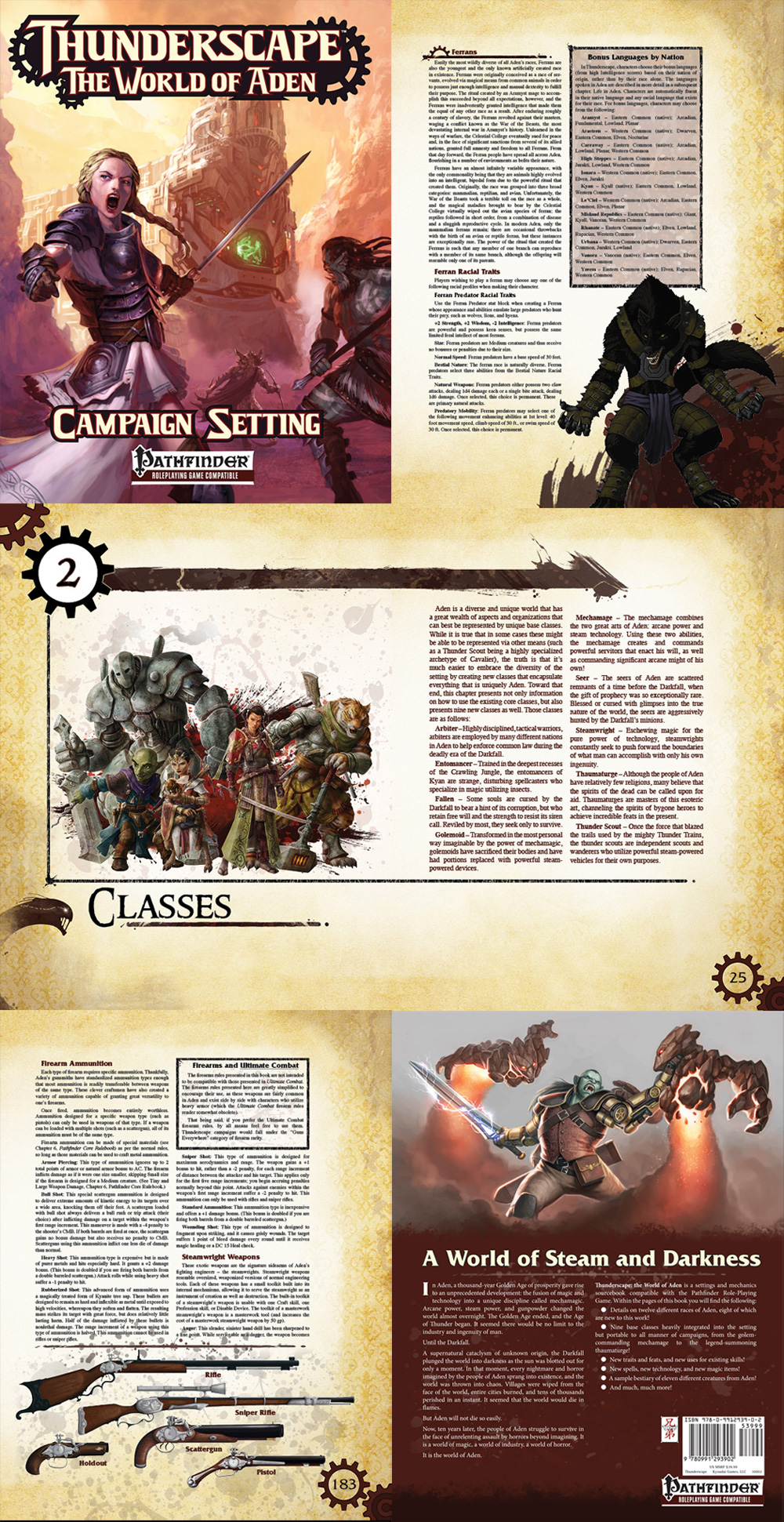 The graphic design and layout of the Thunderscape Pathfinder Supplement. I created graphic elements and did the layout for the book. I also created an optimized, hyperlinked version for mobile devices, and indexed the book. Was solely responsible for establishing the unique look and brand identity of this roleplaying product line. For more information on the book, visit http://kyoudai-games.com/aden/